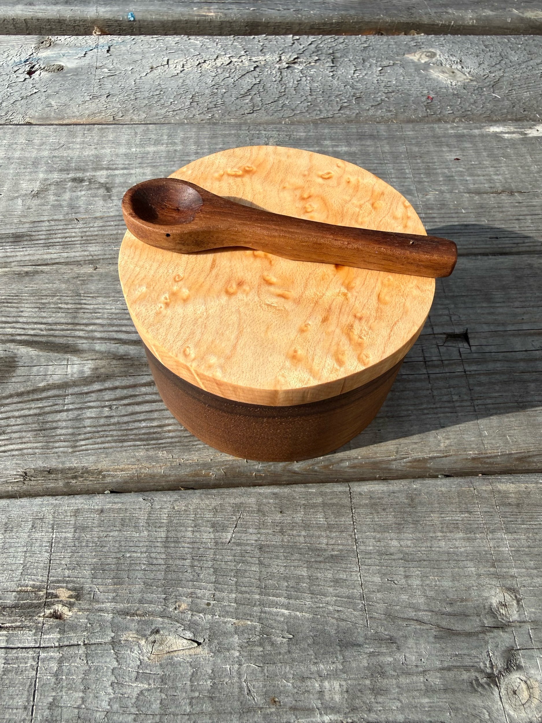 Elevate your kitchen with this beautifully handcrafted salt cellar, made from rich black walnut and topped with a stunning Birdseye maple lid. The natural contrast between the deep, chocolate tones of walnut and the shimmering grain of maple makes each piece truly one of a kind.