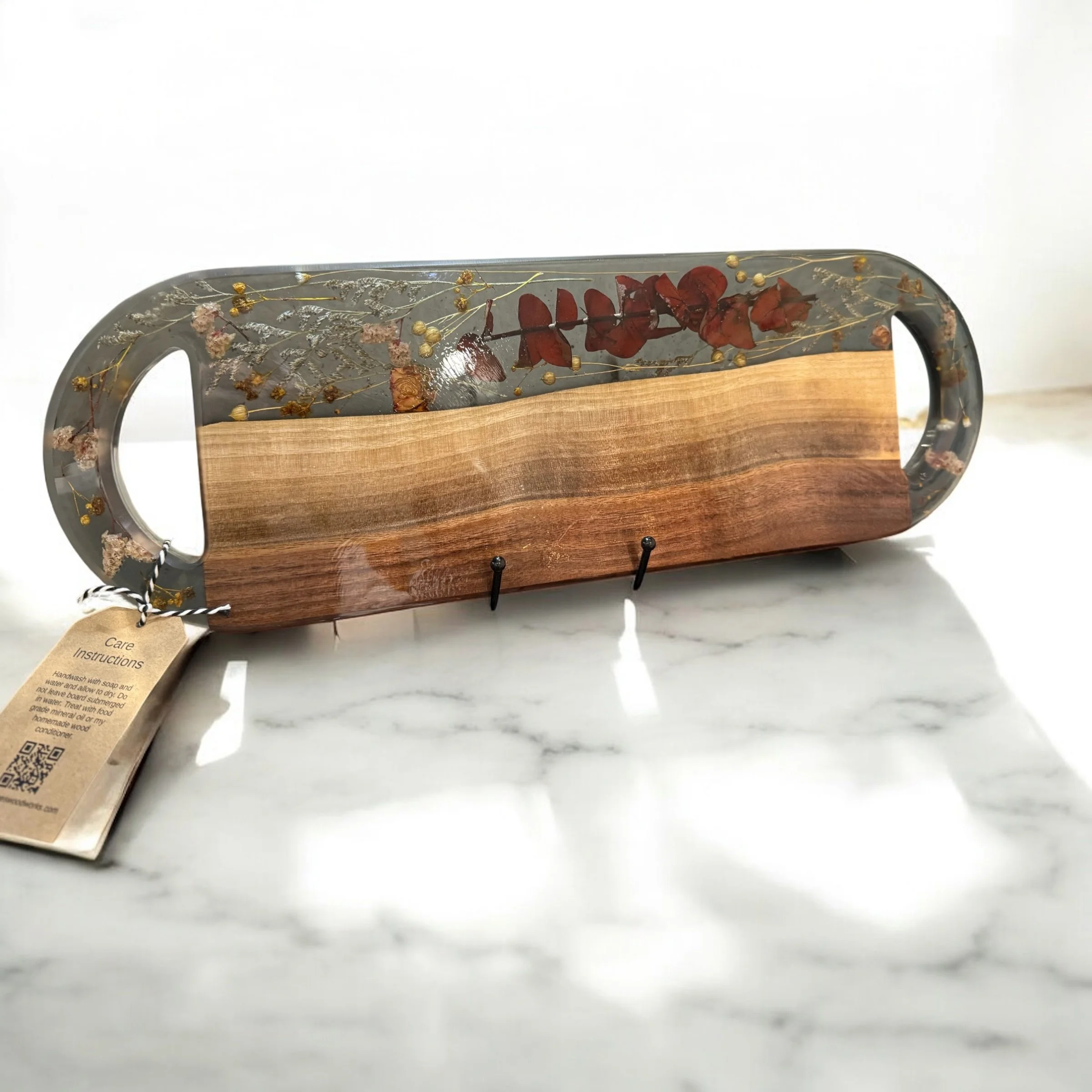 Each board is individually crafted, ensuring that no two are ever alike — the flowers are thoughtfully arranged, and the resin’s glossy finish enhances the natural beauty of the walnut while providing a durable, food-safe surface. Perfect for serving cheeses, meats, fruits, or as a decorative centerpiece, this piece combines rustic charm with contemporary design.